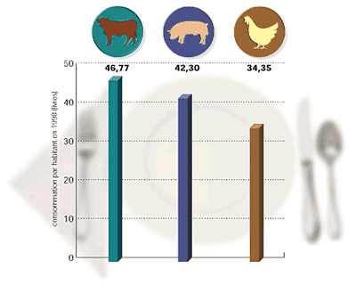 Comme nous l’indiquions dans la livraison de septembre 1999 du Courrier AgriRoyal (voir « Le bœuf est à nouveau rentable »), la consommation de bœuf et de veau par habitant s’établissait à 52,2 livres en 1998, comparativement à 71,6 livres de poulet et à 45,2 livres de porc.